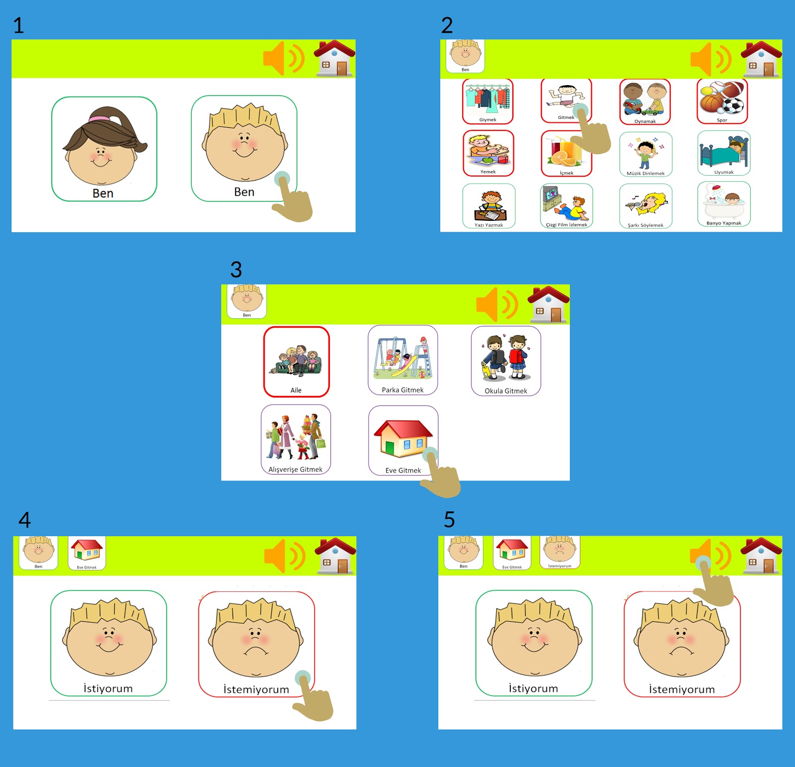 Kullanıcı ne yapmak istediğini veya istemediğini alakalı resimler içeren butonlara tıklayarak sıraya sokar ve en sonunda bunlar sesli olarak uygulama tarafından okunur. Erkek ve kız çocuklar için ayrı seslendirmeler de bulunmaktadır.